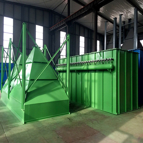 矿山布袋除尘器主体结构由上箱体、中箱体、灰斗、卸灰系统、喷吹系统和控制系统等几大部分组成。并配有基础支柱、爬梯、栏杆、检修门。采用下进气结构,含尘烟气由进风口经中箱体下部进入灰斗,部分较大的尘粒由于惯性的碰撞、自然沉降等作用直接落入灰斗,其它尘粒随气流上升经滤袋过滤后,尘粒被阻留在滤袋外侧,净化后的气体由滤袋内部进入上箱体,再通过出风口经风管、风机排入大气。灰斗中的粉尘定时或连续由卸料器排出。